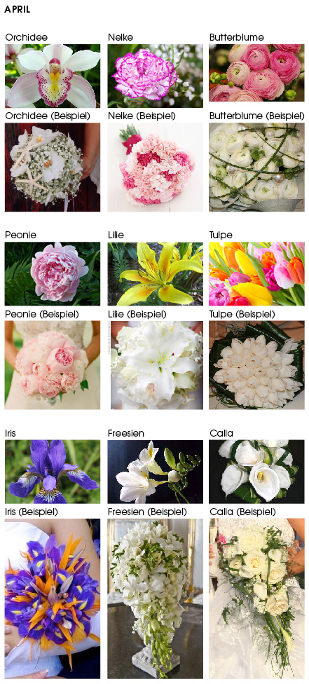 April: Orchidee Nelke Butterblumen Peonie Freesien Iris Tulpe Calla Lilie |