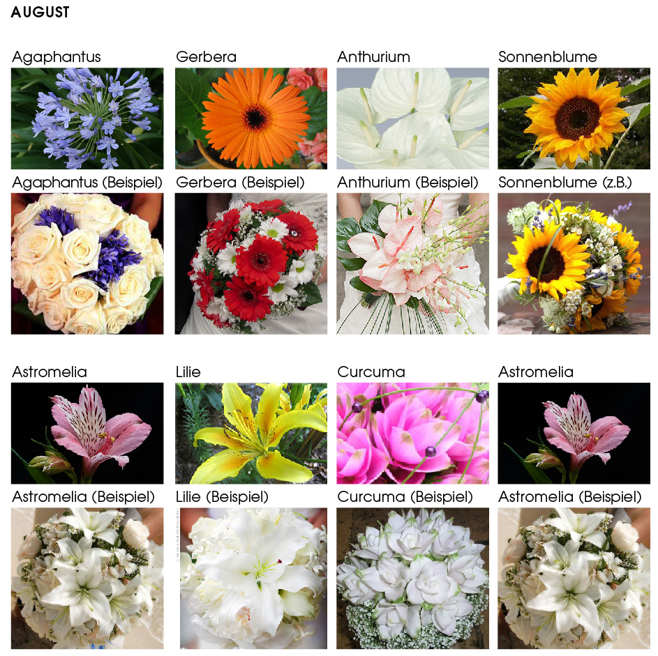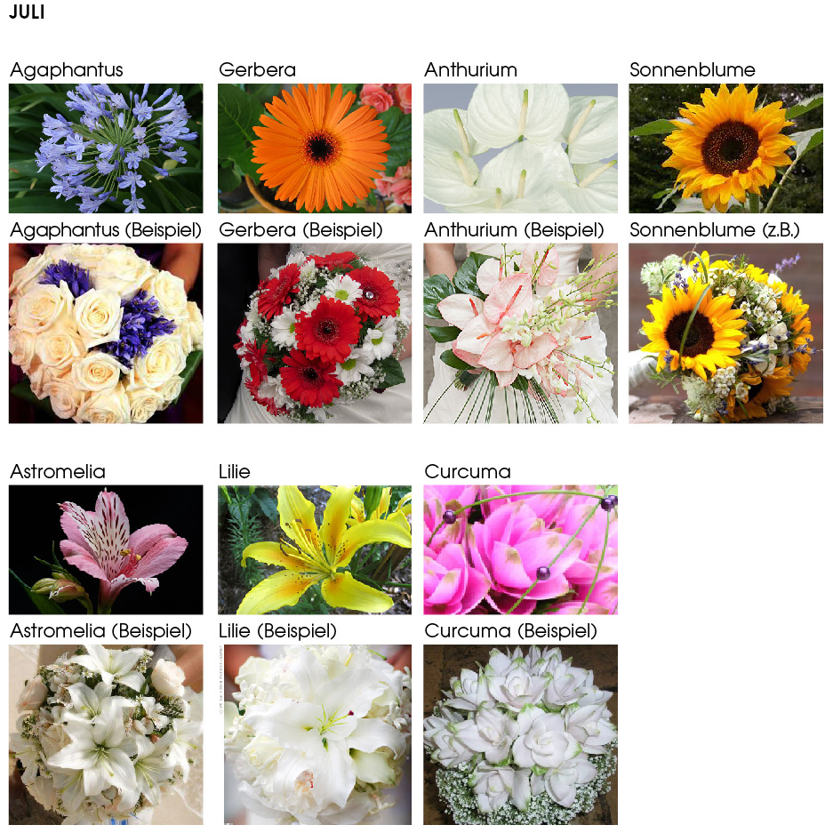 Juli: Gerbera Agaphantus Anthurium Sonnenblume Astromelia Lilie Curcuma |