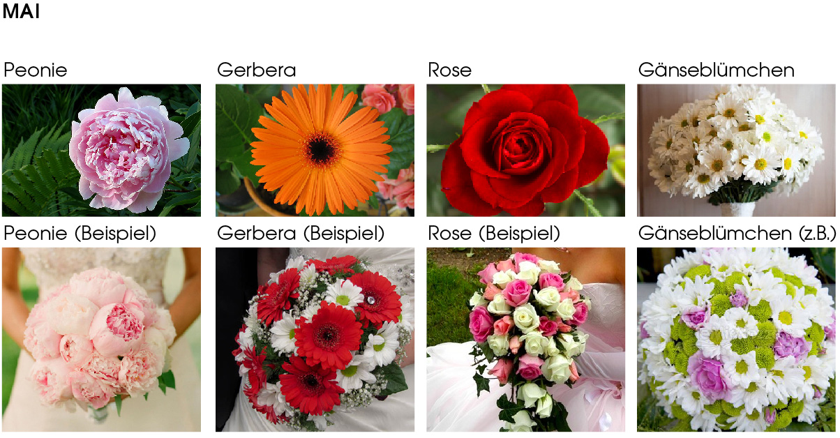 Mai: Rose Gerbera Peonie Gänseblümchen |