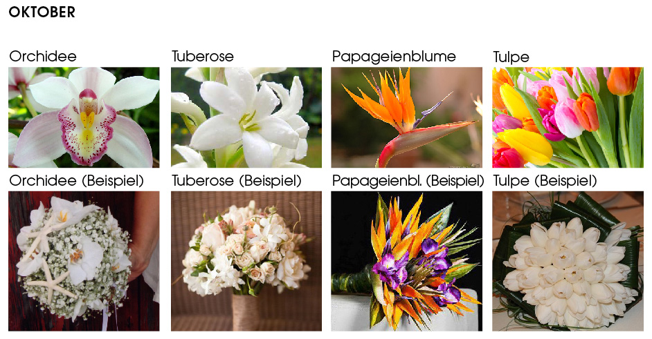 Oktober: Orchidee Tuberose Papageienblume Tulpe |